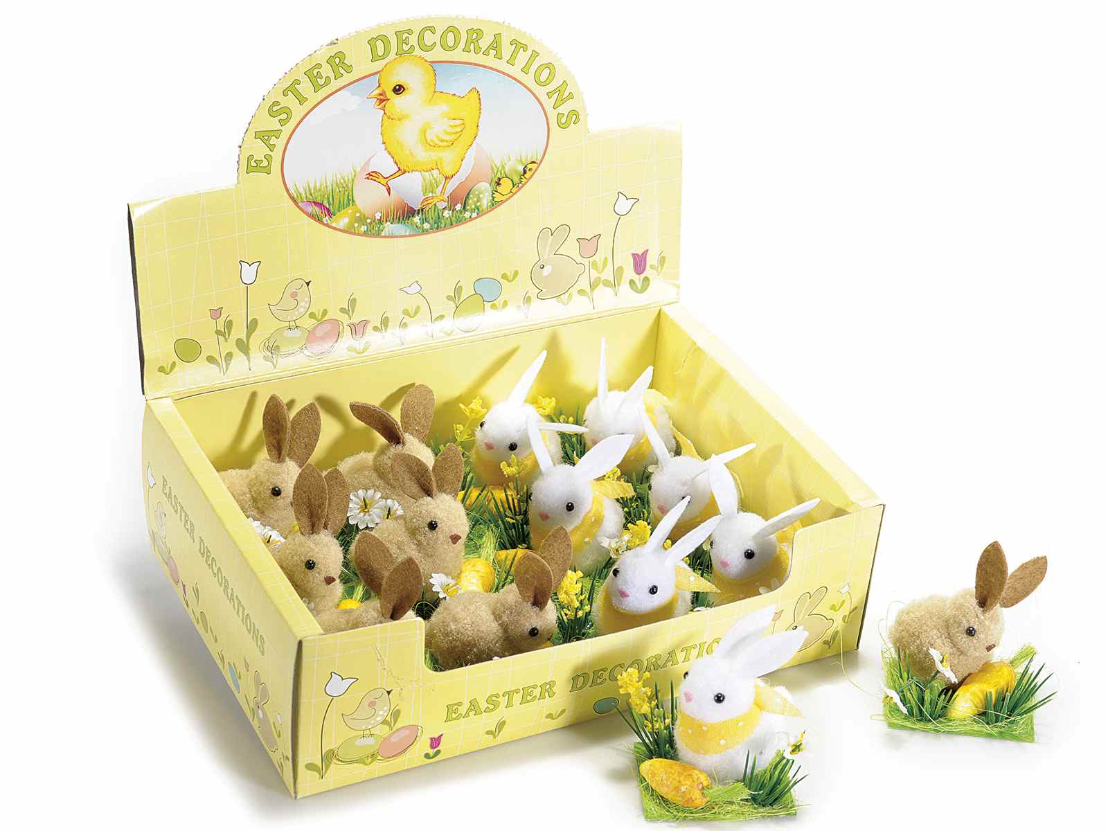 Conigli decorativi di Pasqua con carota e fiori su zolla d'erba in espositore da 12 pezzi