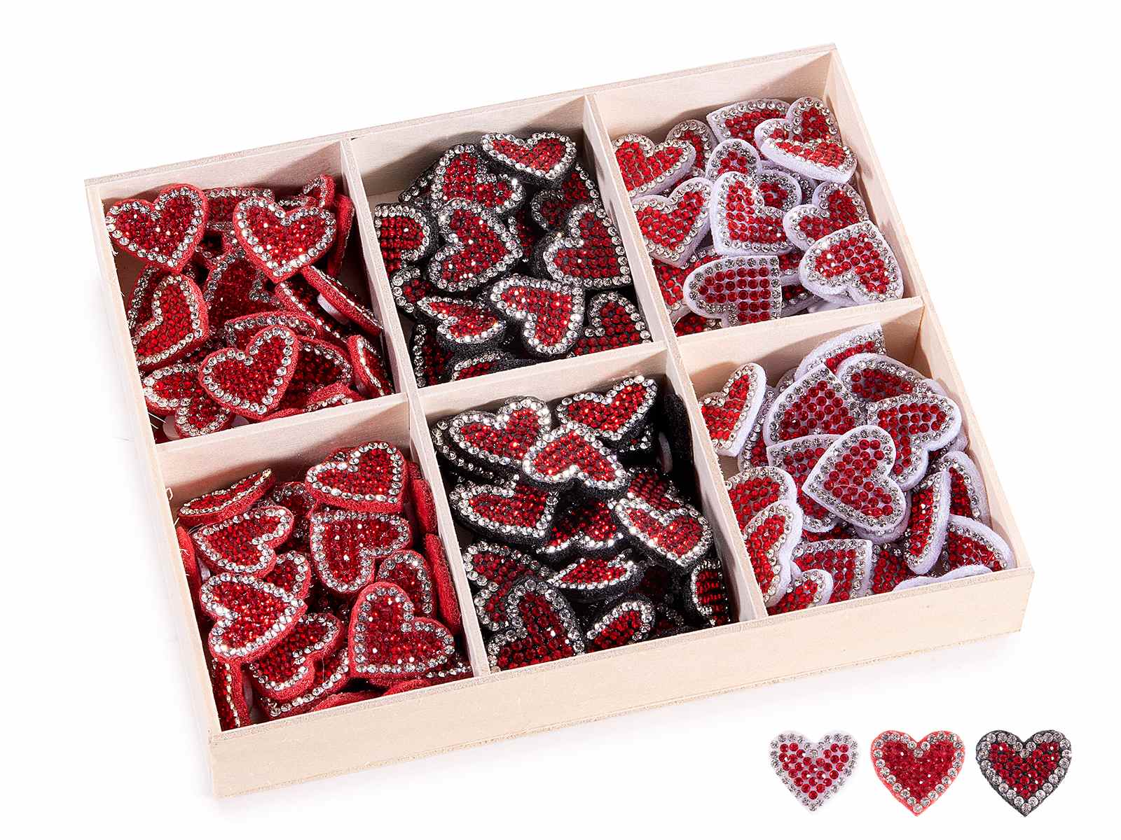 Cuori biadesivi in panno con strass in espositore da 144 pezzi, ideali per San Valentino e packaging innamorati