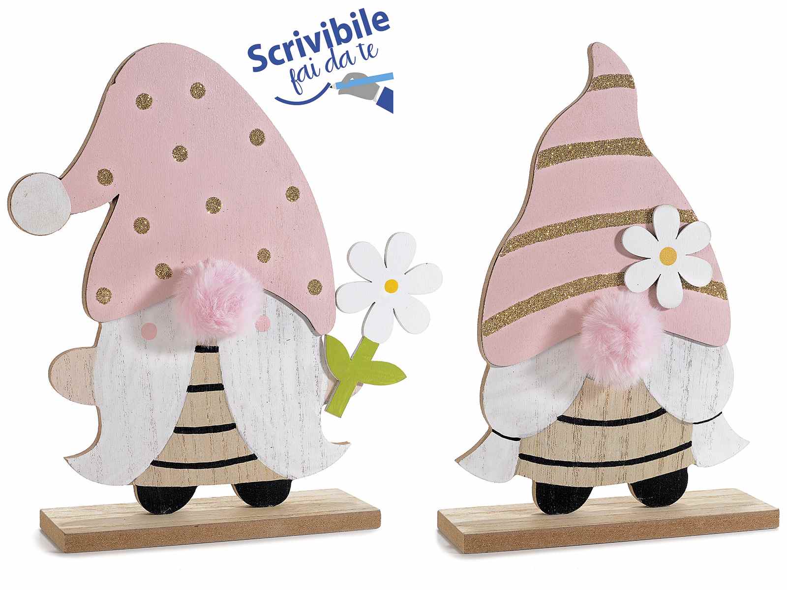 Gnomo in legno da appoggiare con fiore e dettagli glitter