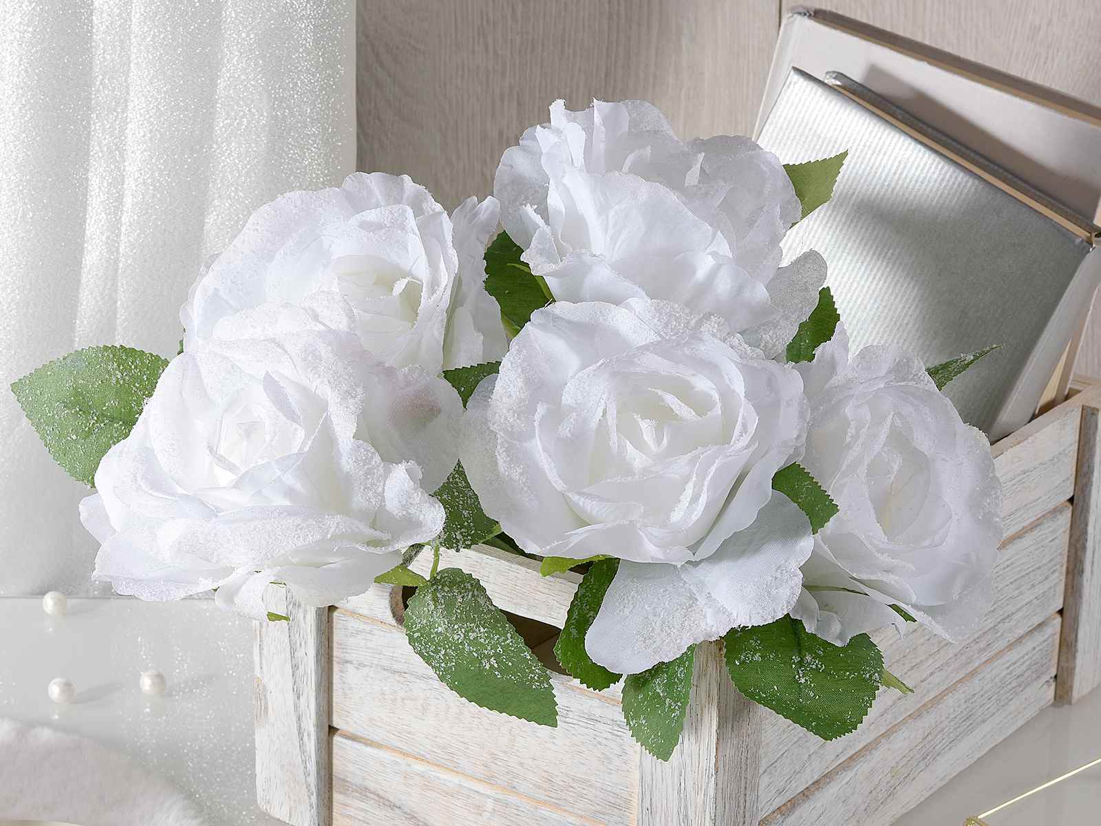 Mazzi di rose bianche artificiali ad effetto innevato