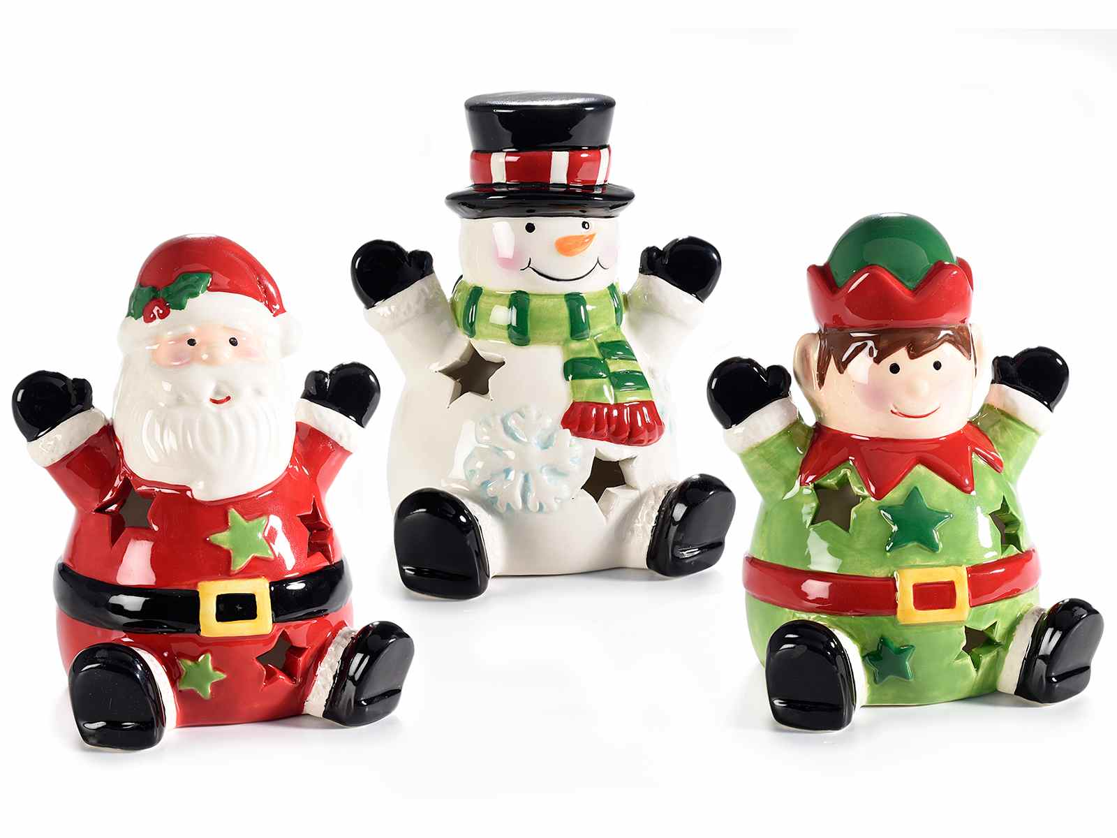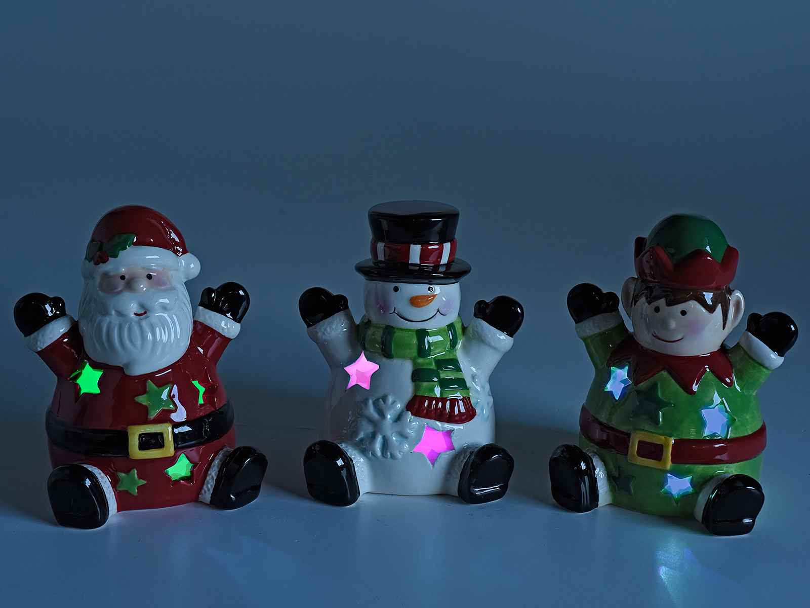 Personaggi natalizi decorativi in ceramica con luci led multicolore