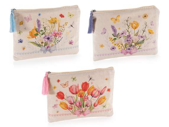 Pochettes / astucci in canvas con decori floreali, zip e nappina colorata