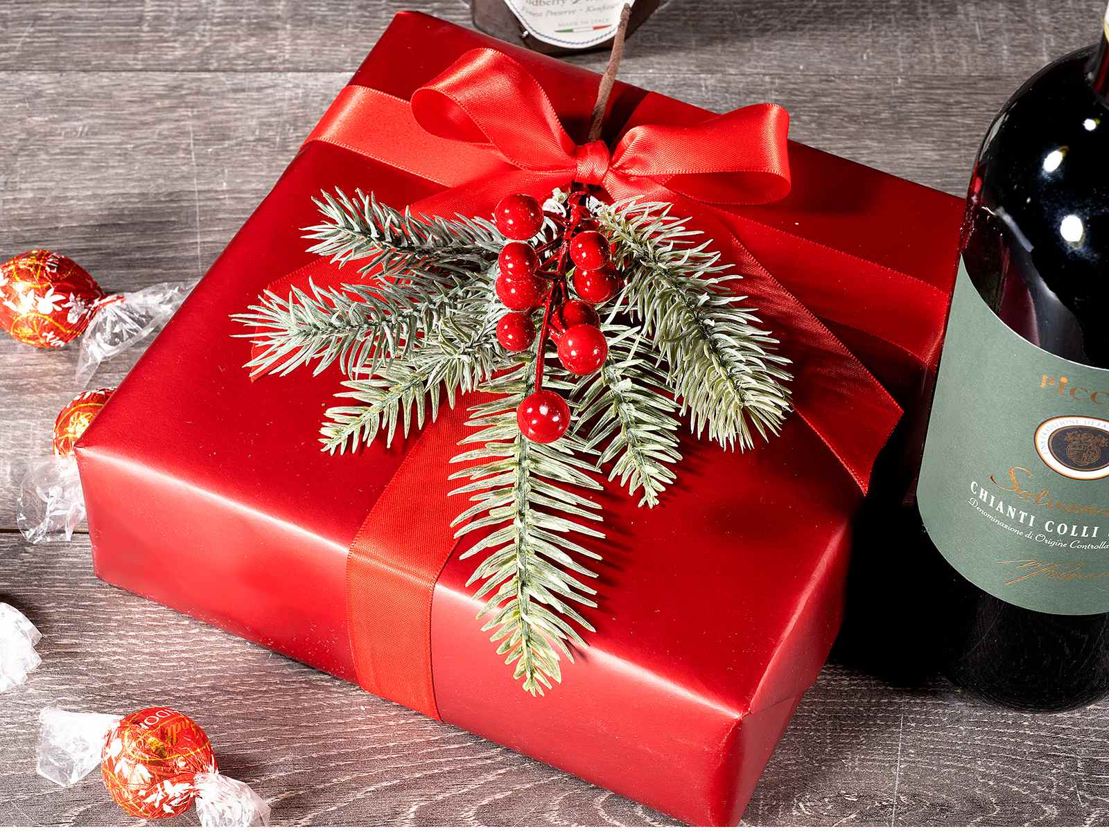 Rametto di abete artificiale innevato con bacche rosse