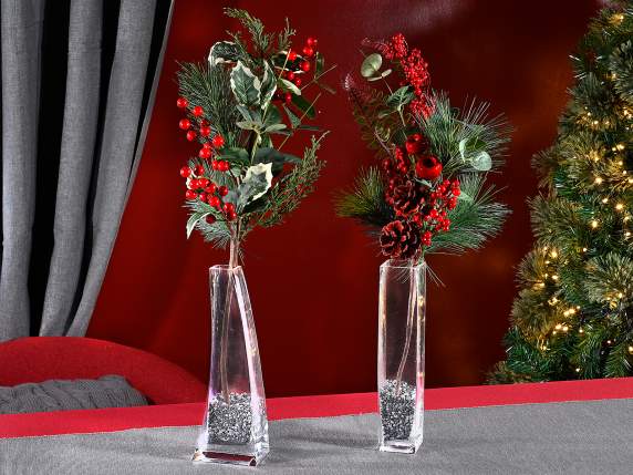 Ramo di pino e foglie con bacche rosse artificiali