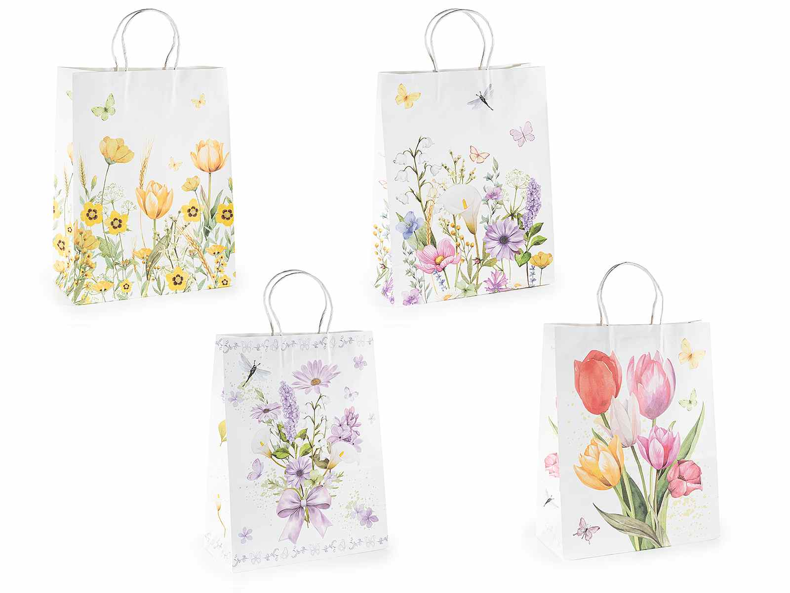 Borsa in stoffa con stampa fiori di campo e manici colorati |