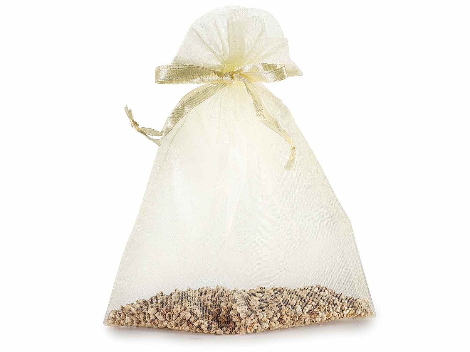 Sacchetti organza giallo paglierino con coulisse di chiusura in raso è ideale per confezionare articoli da regalo. L'eleganza semitrasparente del tessuto in organza rende i sacchetti perfetti anche per la creazione di bomboniere.