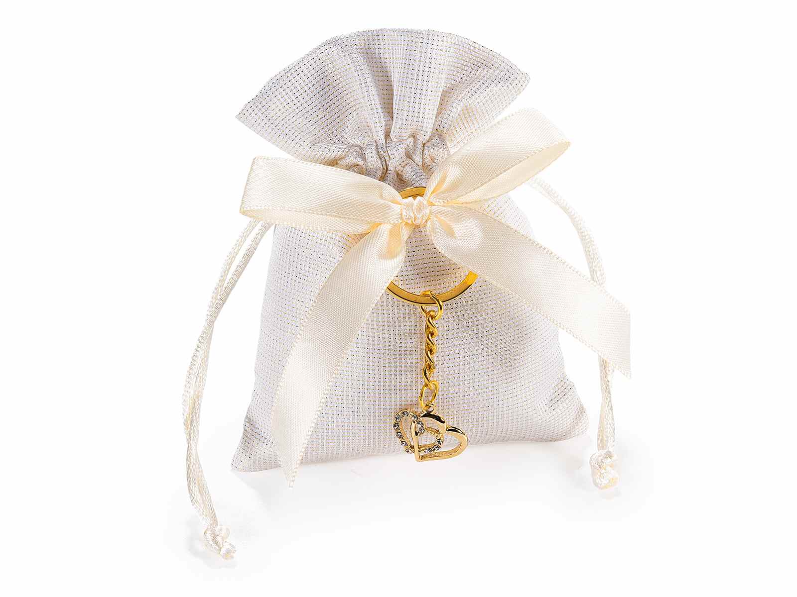 Sacchetti bomboniera in stoffa con portachiavi in metallo dorato a cuori