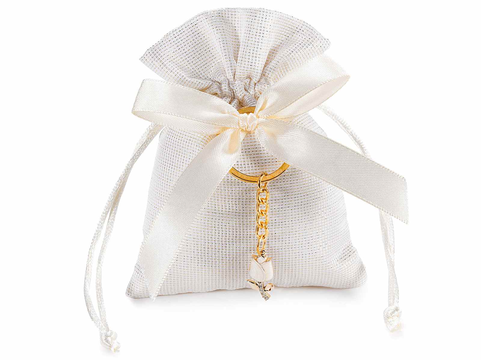 Sacchetti bomboniera in stoffa con portachiavi metallo con tulipano bianco e fiocco