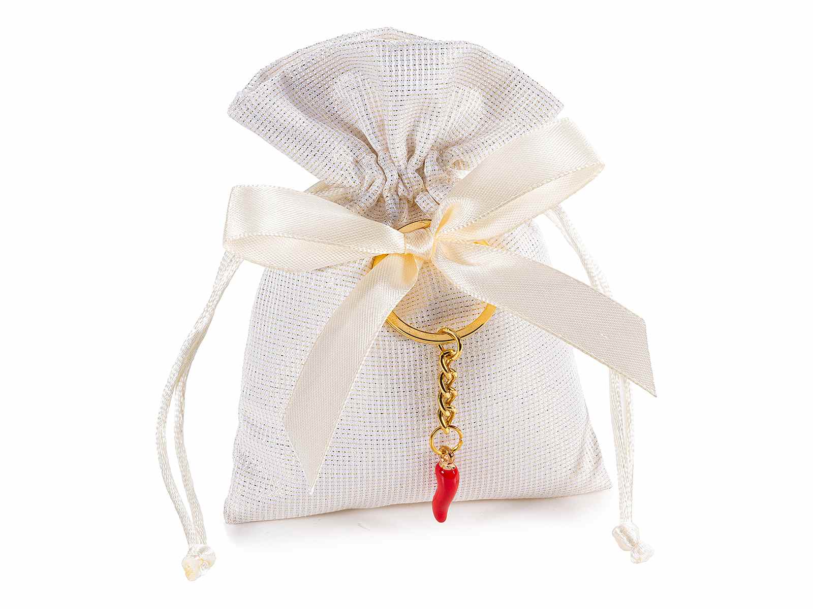 Sacchetti bomboniera in stoffa con portachiavi metallo a cornetto portafortuna