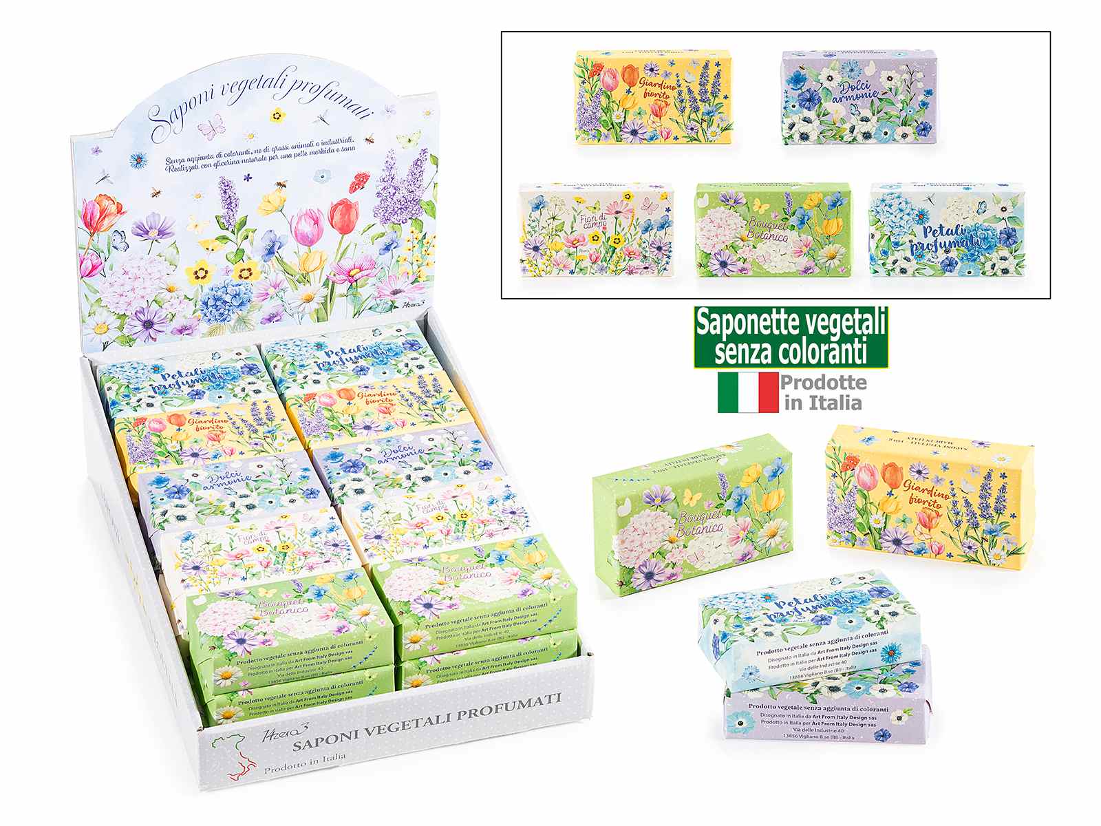 Saponette profumate vegetali con stampa fiori di campo, senza coloranti e prodotte in Italia, in espositore da 30 pezzi