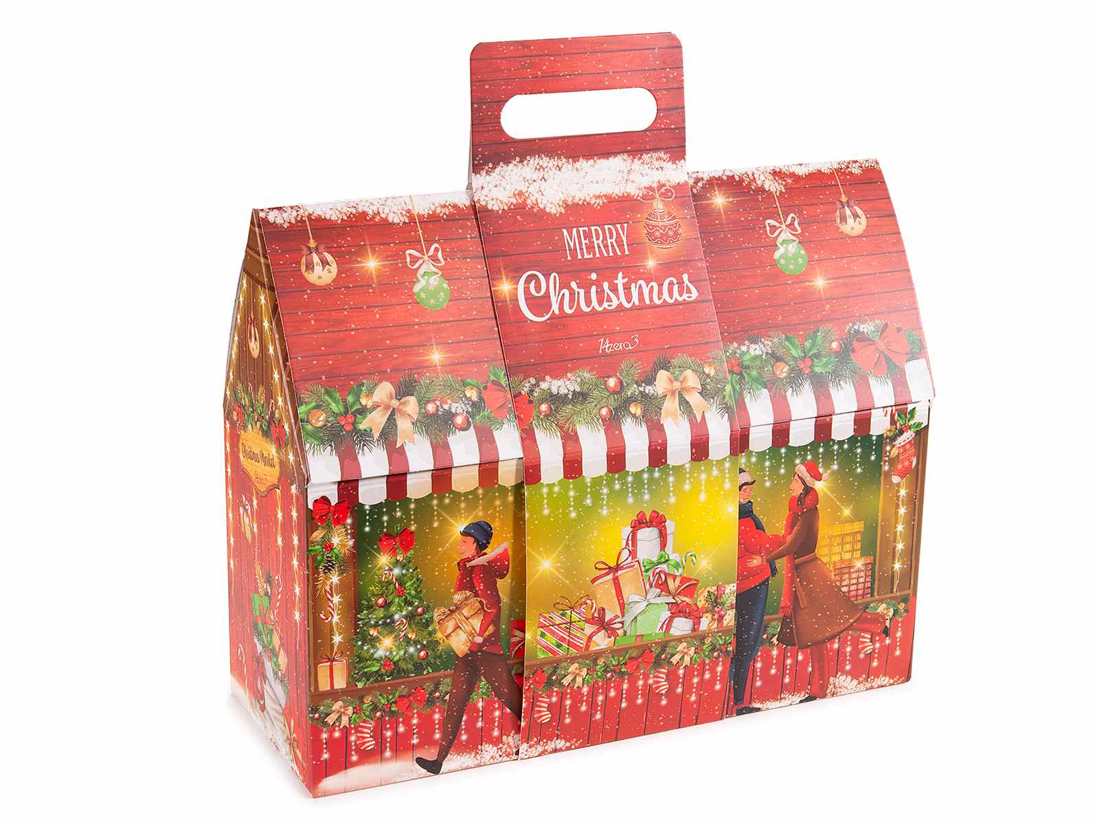 Scatole natalizie a forma di casetta con manico integrato, in cartone rigido decorato con scene natalizie, e scritta Merry Christmas. Perfette per confezionare dolci, panettoni, bevande e regali. Ideali per pasticcerie, enoteche e negozi.