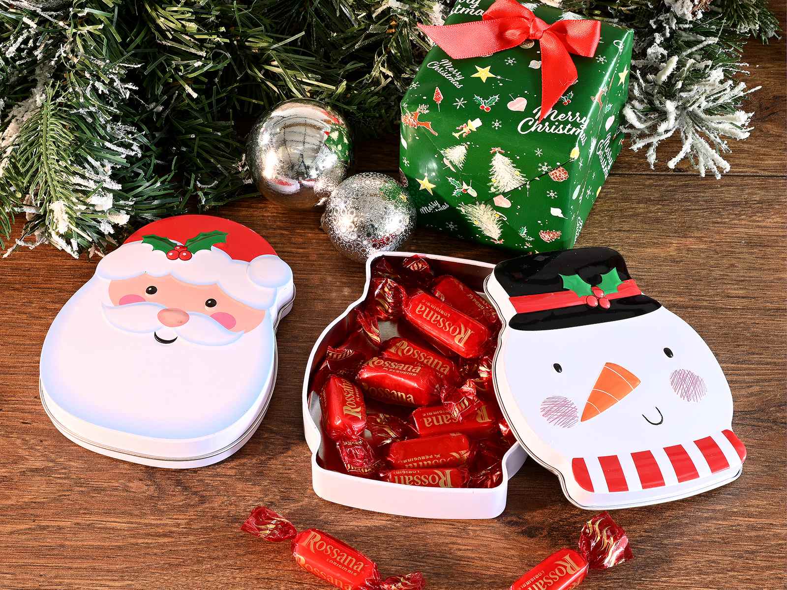 Scatole di Natale in metallo con disegni natalizi a forma di Babbo Natale e pupazzo di neve in rilievo.