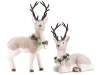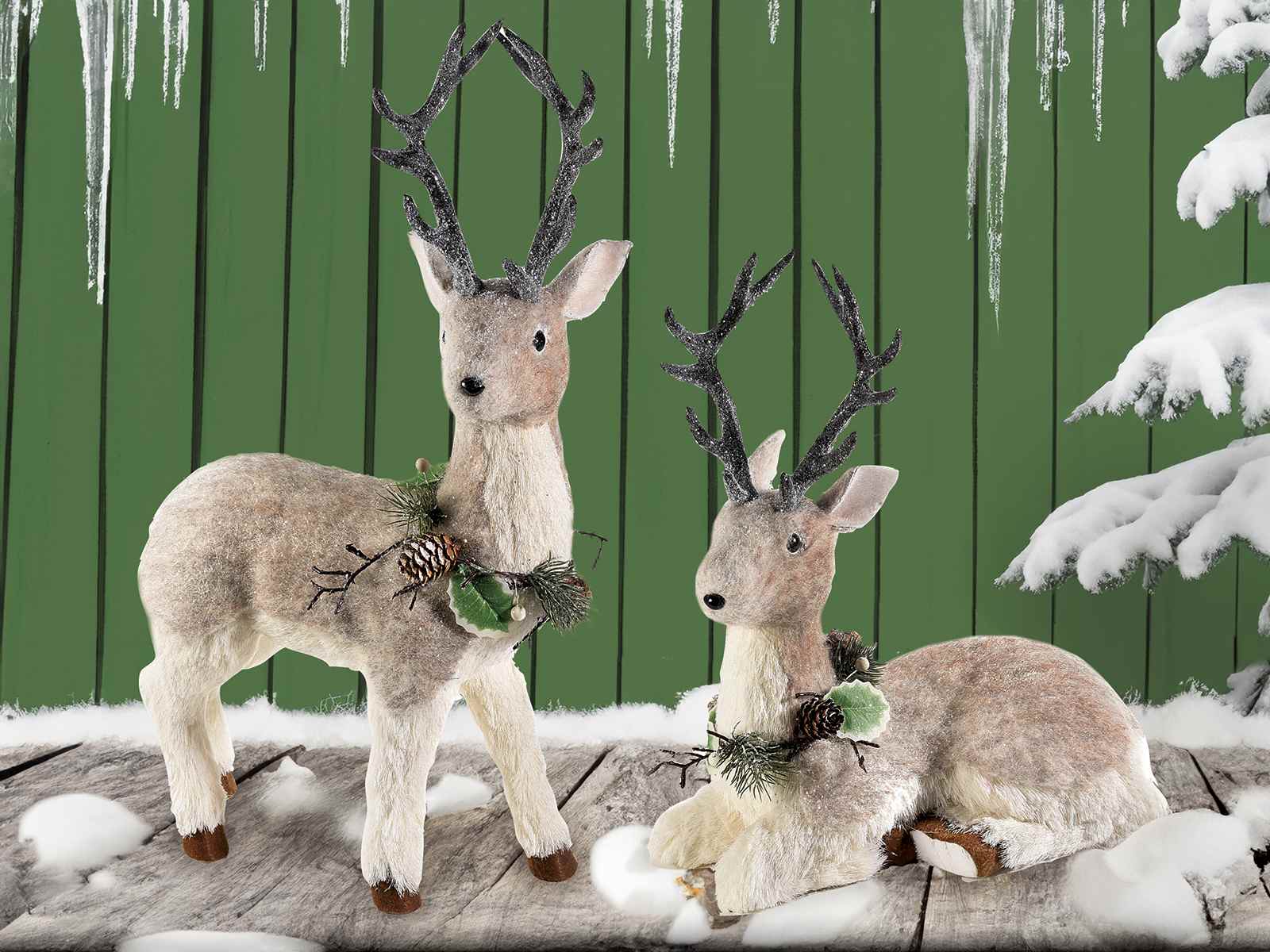 Renne decorative in fibra con collana di pigne ed aghi di pino innevati in set da due pezzi
