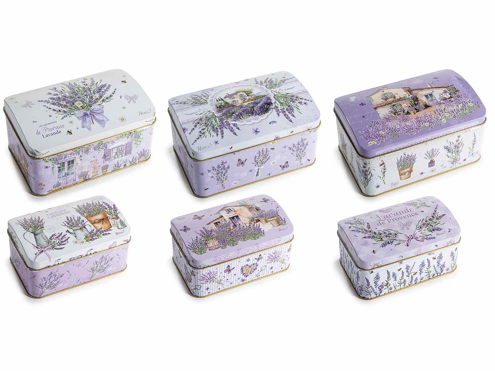 Scatole in metallo adatte al contatto alimentare con decori lavanda in set da 3 pezzi