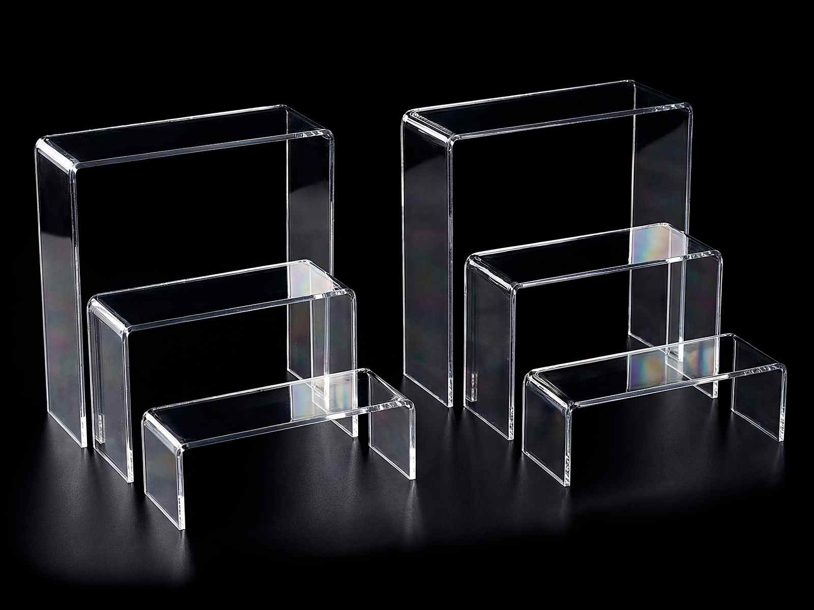 Panchette trasparenti leggere e resistenti, ideali per allestire vetrine ed esporre. Realizzate in acrilico ad alta densità, garantiscono stabilità e un design moderno. Le diverse misure si inseriscono una nell’altra, ottimizzando lo spazio