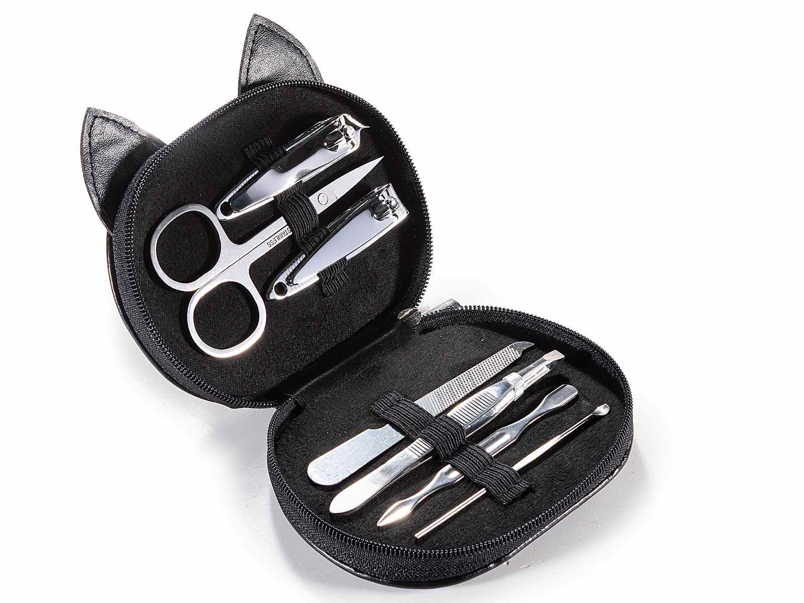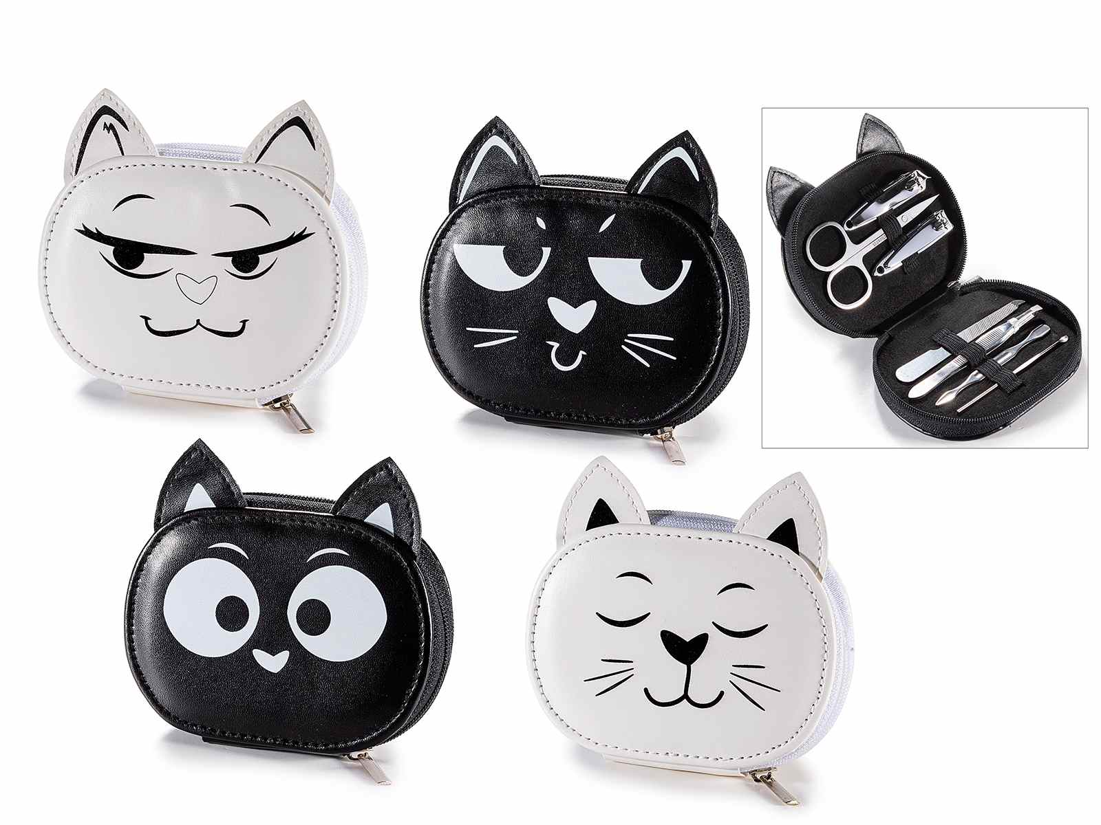 Astuccio con set manicure in similpelle a forma di gatto con 7 accessori per unghie