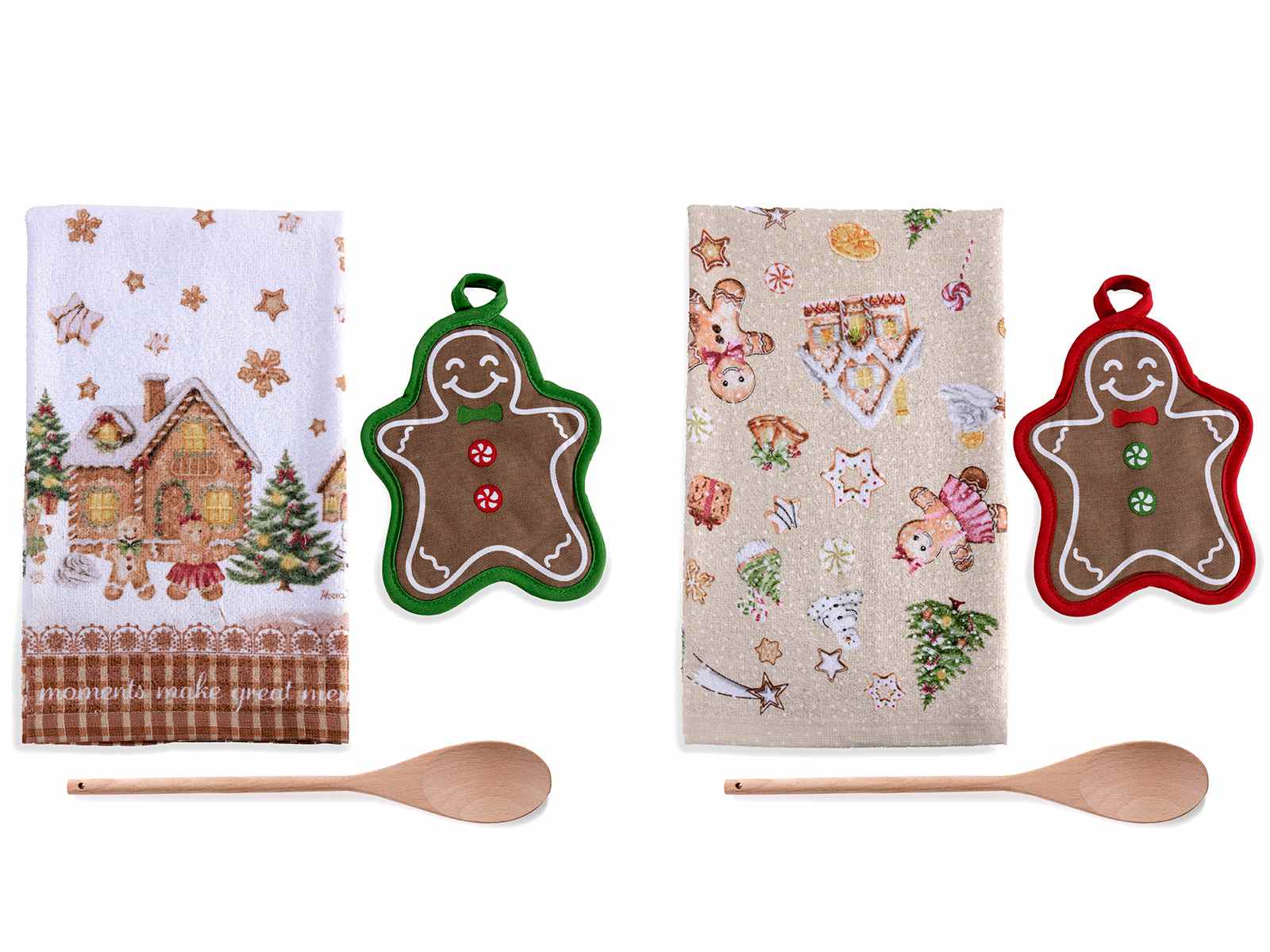 Set natalizi con asciugapiatti in cotone, presina sagomata a omino pan di zenzero e cucchiaio in legno. L'idea regalo perfetta per portare il Natale in cucina