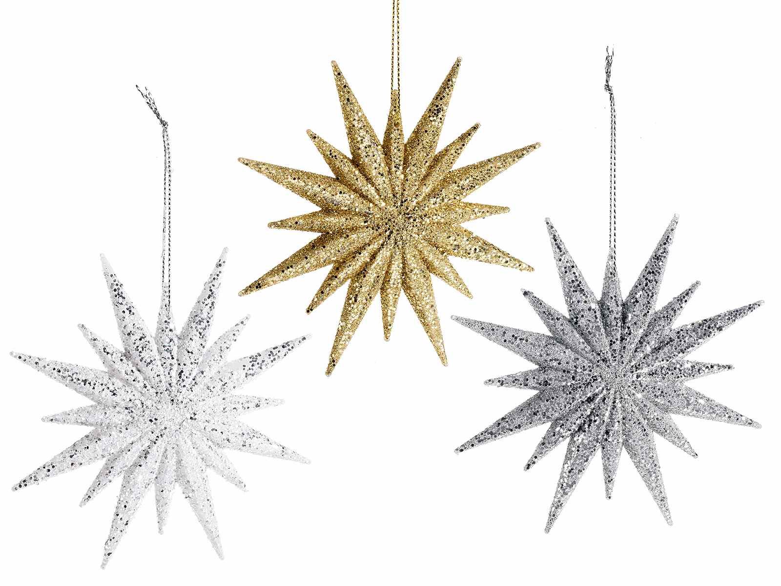 Stelle glitterate bianco, oro e argento effetto vetro da appendere