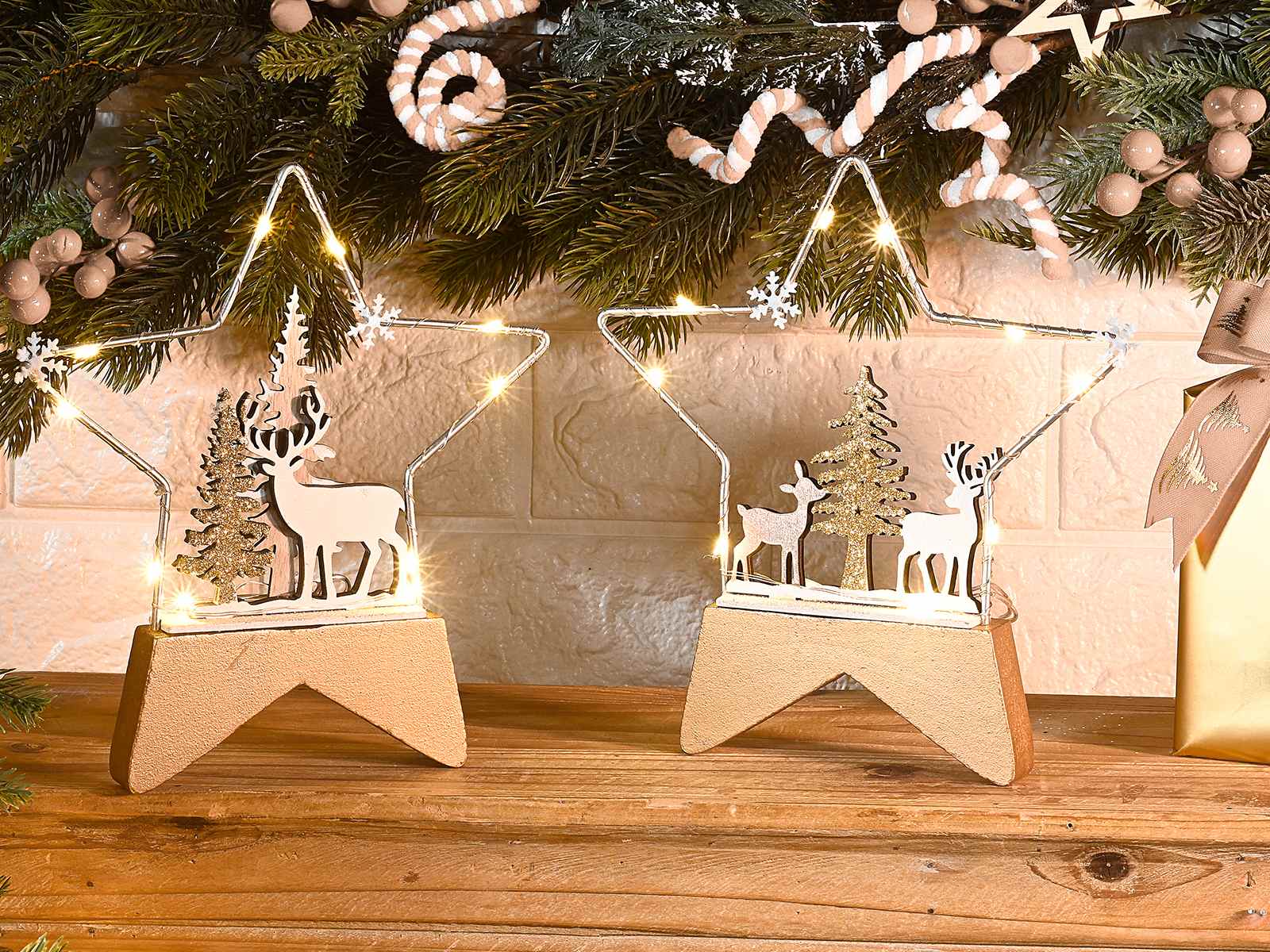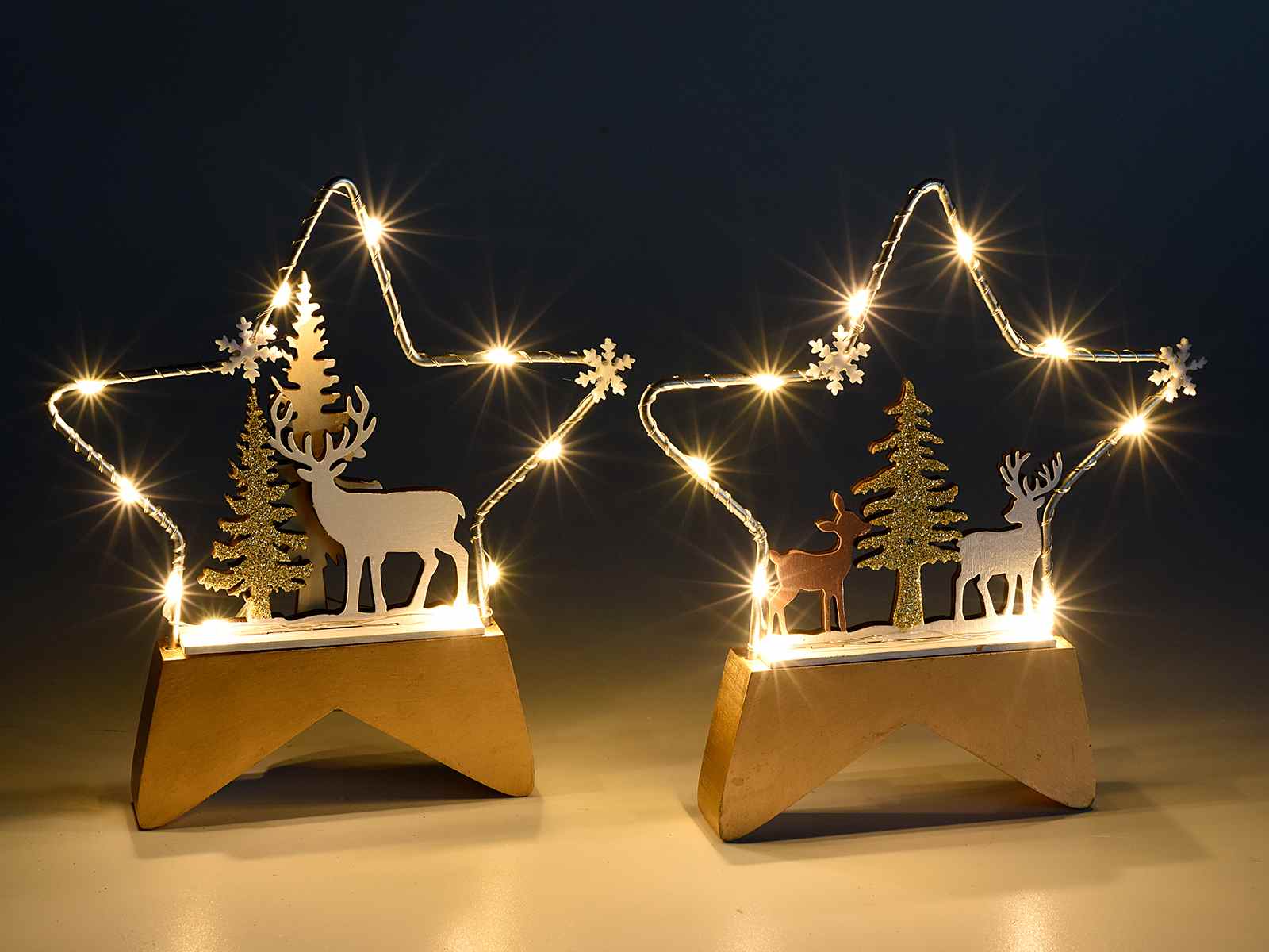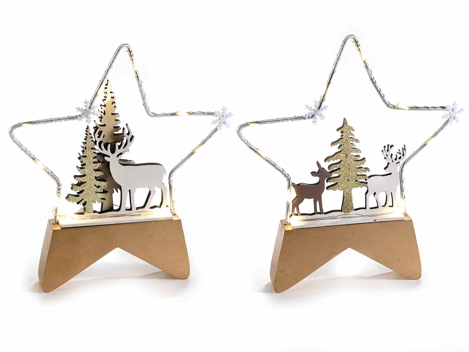 Decorazione di Natale luminose a stelle decorative in metallo con paesaggio, renne e base in legno con luci LED