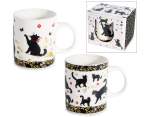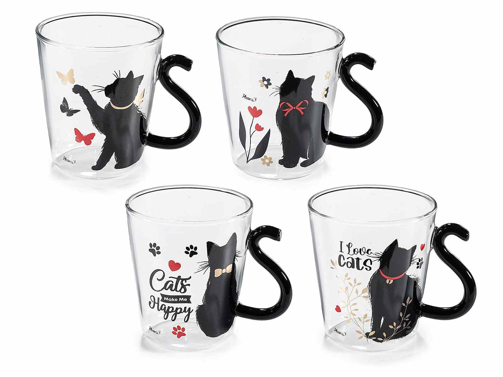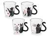 Tazze in vetro trasparente con manico a coda di gatto e scritte a tema