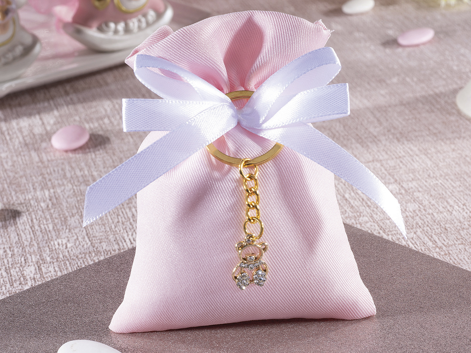 Bomboniere bimba: sacchettino rosa con ciondolino ad orsetti portachiave