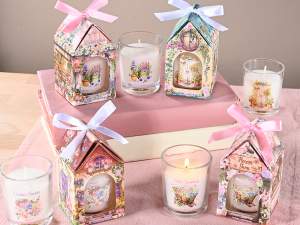 Candele profumate in bicchiere di vetro e confezione regalo a forma di casetta con fiocchetto e decorazioni primaverili con fiori