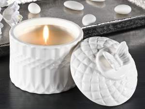 Candele profumate in barattolino di porcellana con coperchio con manico a forma di cuore e con decorazioni in rilievo