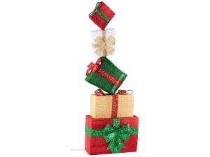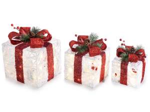 Set 3 pacchi regalo natalizi luminosi in metallo con LED bianco caldo. Perfetti per vetrine, allestimenti e decorazioni natalizie, creano un’atmosfera elegante e festiva. Ideali per interni ed esterni, aggiungono un tocco scintillante a scenografie.