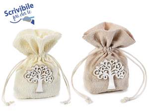 Sacchetti in stoffa froissè colore ecrù con fiocchetti, cuoricino e chiusura con tirante