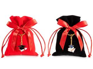 Sacchetti Laurea bomboniera porta confetti in velluto con fiocco e portachiavi in metallo a forma di tocco e pergamena, con tirante di chiusura