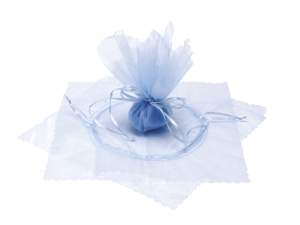 Tulle a sacchetto per bomboniera in organza azzurro con tirante, base a stella e bordi a onda