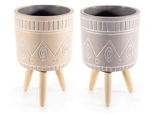 Vaso in cemento su treppiede in legno con decorazioni e scritta Home
