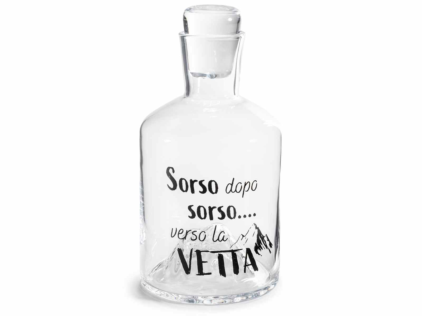 Sticle de sticlă potrivite pentru contactul cu alimentele, cu capac și inscripția „Înghițitură după înghițitură”, spre vârf.