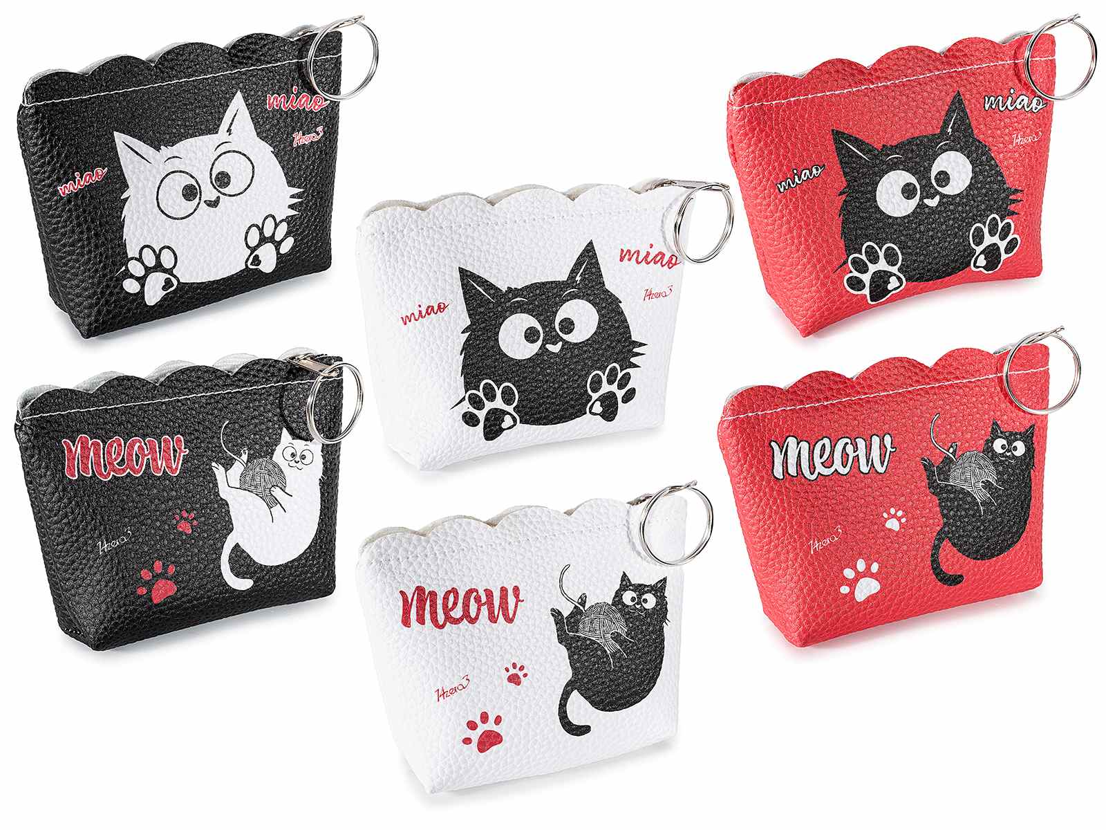 Portofel colorat din piele ecologică cu fermoar, breloc și imprimeu cu pisică