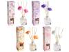 Difuzoare de parfumuri din sticlă pentru cameră, cu bețișoare din lemn, cu flori colorate și o cutie decorată.