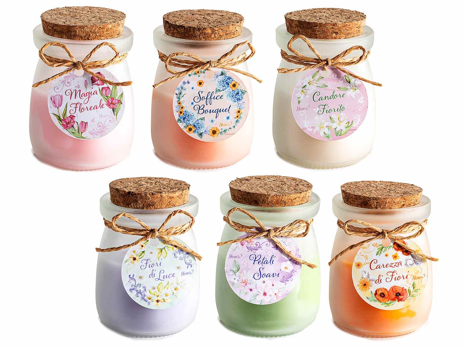 Lumânări parfumate într-un borcan de sticlă opacă cu dop de plută, fundă de iută și etichetă florală.