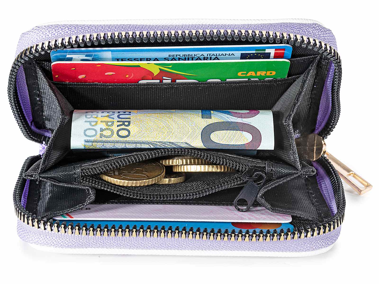 2 scomparti per banconote - Tasca centrale portamonete con chiusura a zip - 4 scomparti portacarte