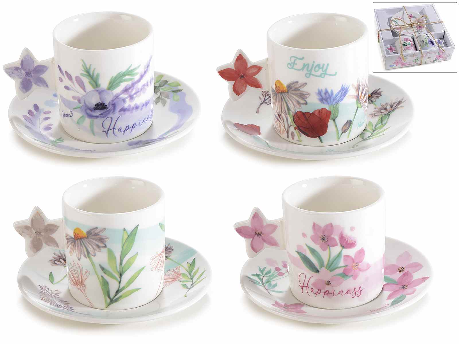 Ce?ti ?i farfurioare din por?elan cu mânere în forma de floare, decora?iuni florale, într-o cutie cadou din doua piese