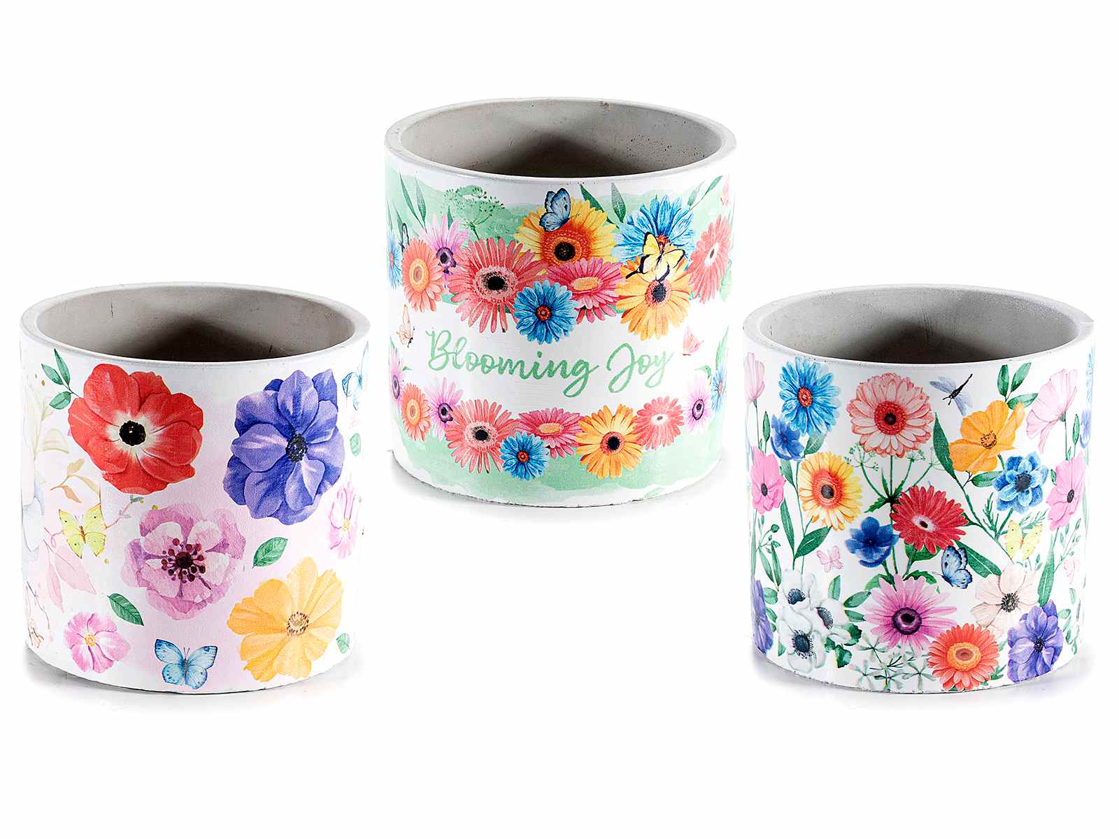 Vaze rotunde din beton cu decorațiuni florale colorate și inscripții
