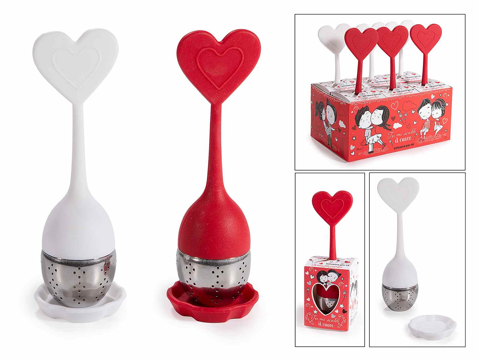 Infuzor de ceai în formă de inimă, din oțel inoxidabil și silicon, format din 6 piese, cu farfurie, într-o cutie cadou de Ziua Îndrăgostiților