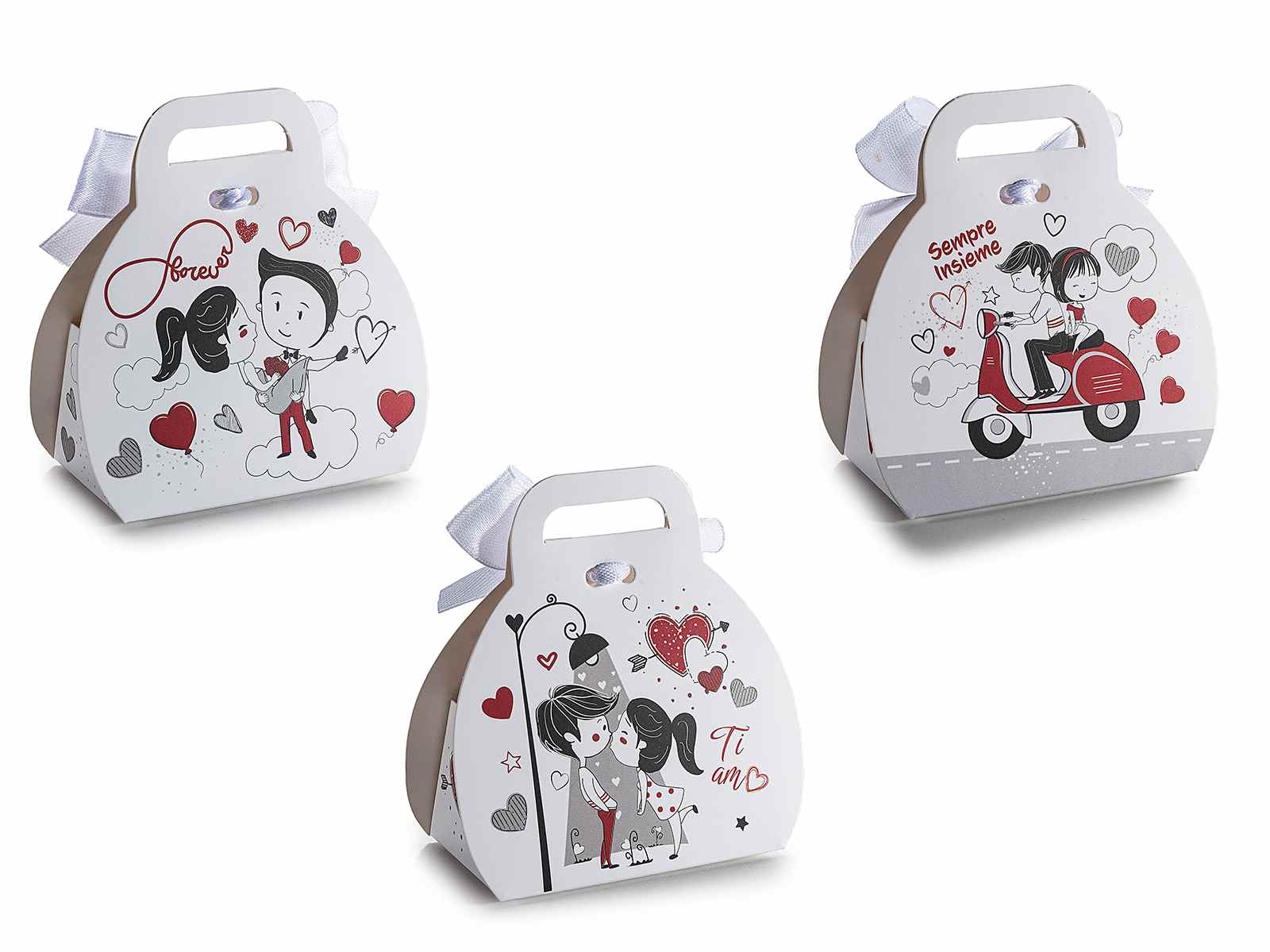 Set de cutii cadou din hârtie cu un imprimeu cu dragoste, o fundă și o felicitare. Perfect ca o amintire de nuntă sau cadou de Ziua Îndrăgostiților sau pentru aniversări.