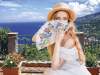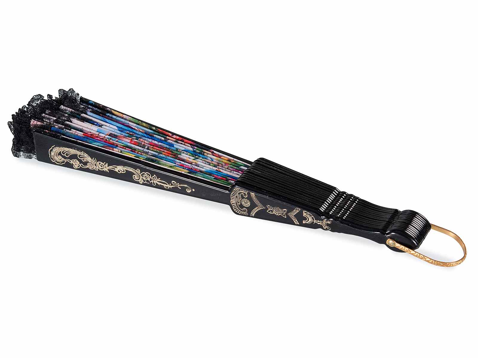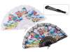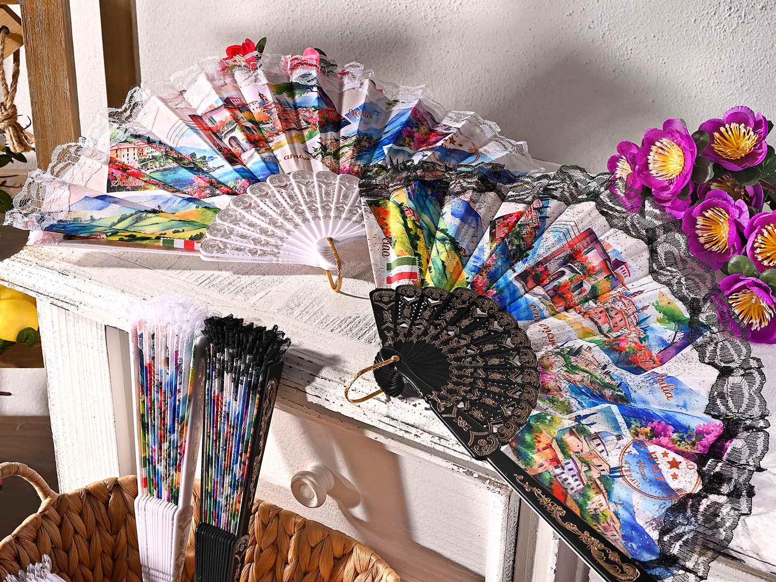 Evantai pliabil italian, suvenir, din plastic și material textil, cu imprimeuri peisagistice/panoramice italiene și cârlig