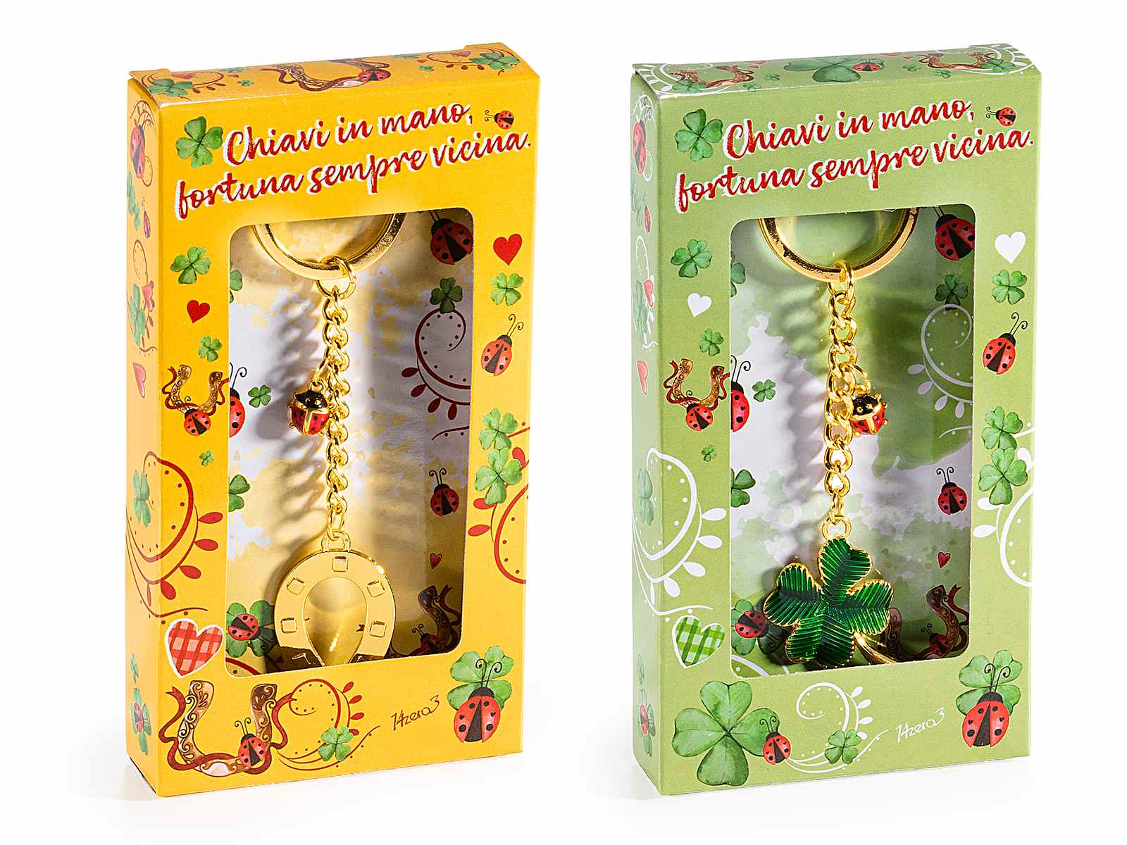 Breloc metalic cu potcoavă și trifoi cu patru foi și decorațiune în formă de buburuză norocoasă, într-un display cu 12 piese