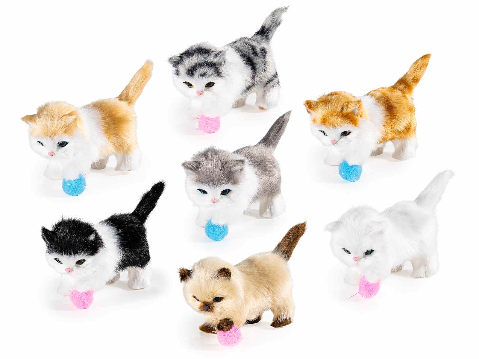Pisicuțe decorative în miniatură care se joacă în blană artificială, cu atenție la detalii și detalii realiste.
