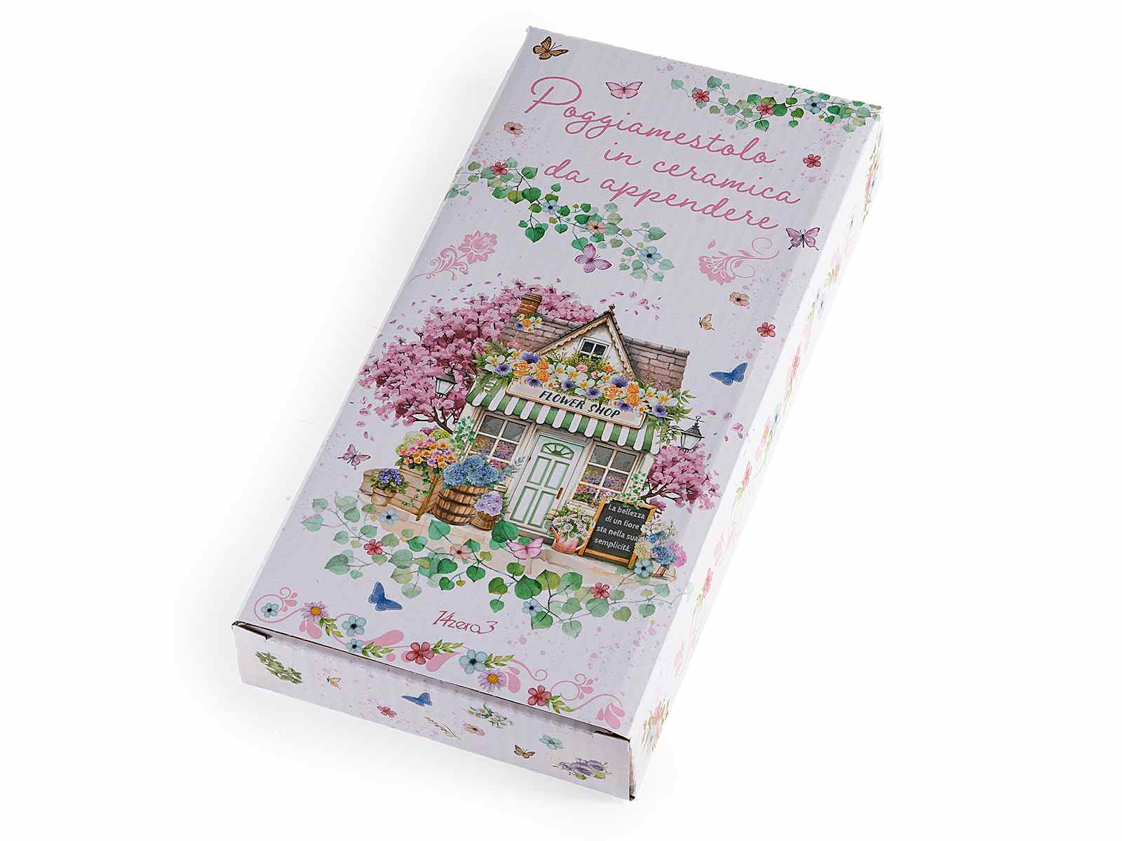 Suport de lingură din ceramică cu decorațiuni de primăvară și fundă, într-o cutie cadou
