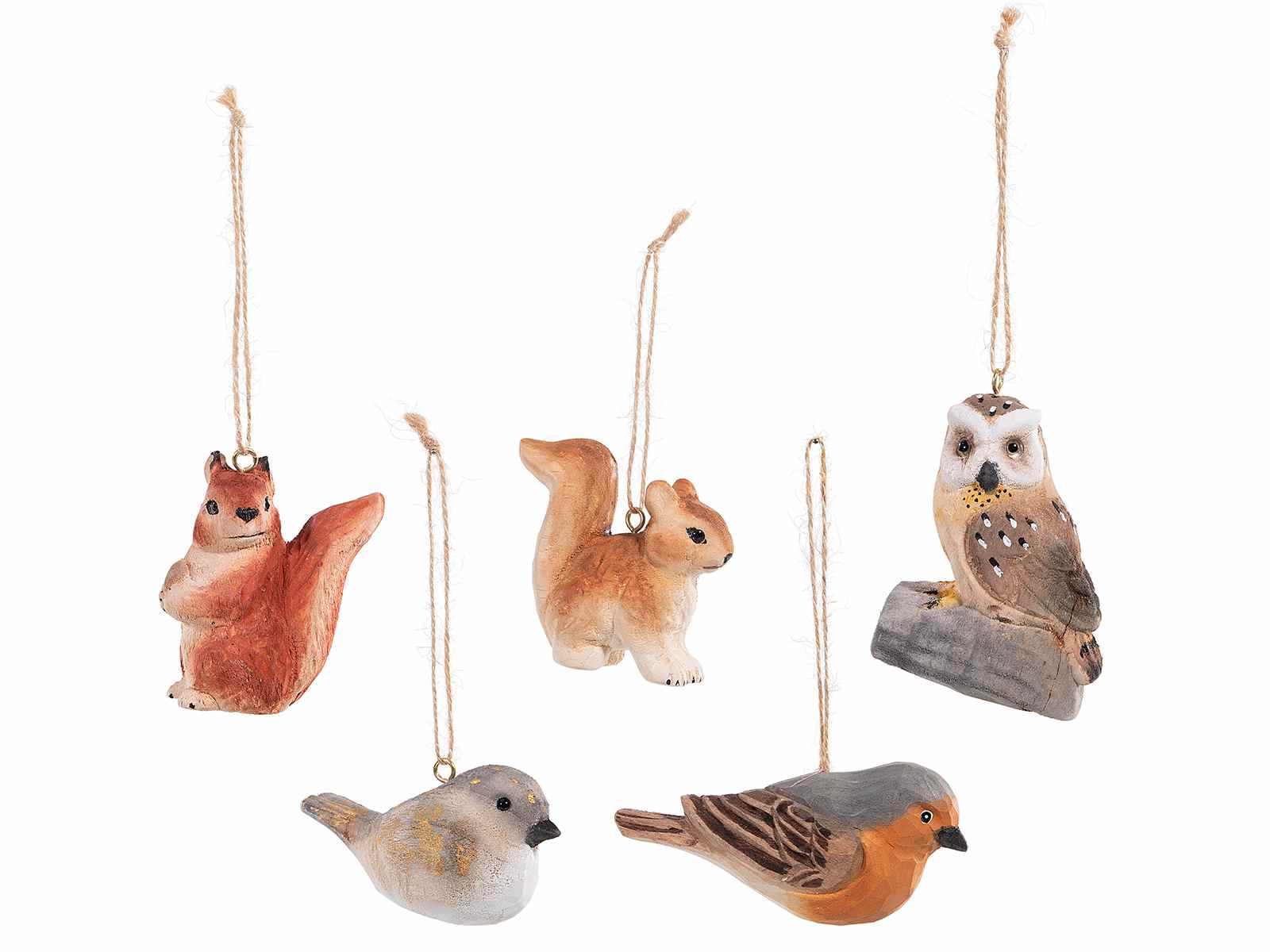 Decorațiuni de toamnă cu animale de pădure, păsări, veverițe și bufnițe, realizate din lemn colorat, cu sfoară pentru agățat.