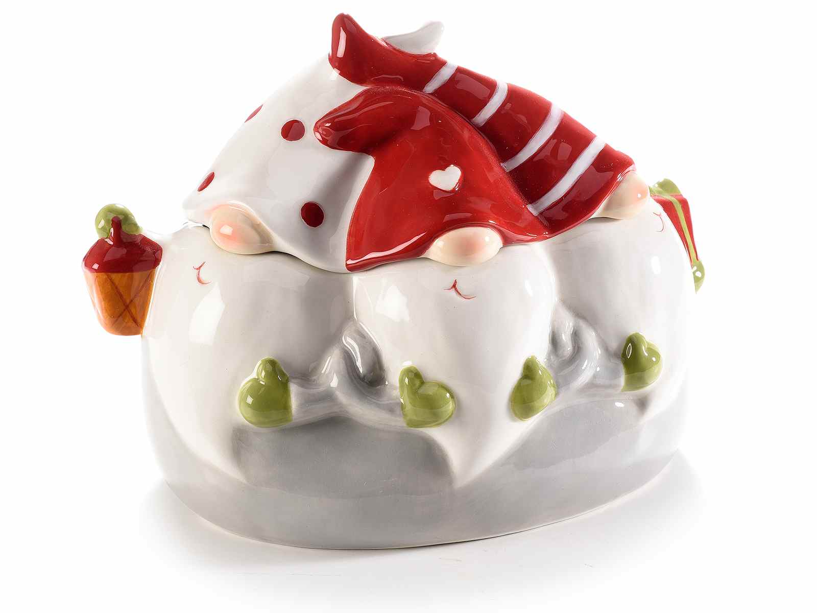 Borcane de Crăciun / Borcan pentru biscuiți / Recipient pentru alimente / Borcan pentru dulciuri din ceramică colorată cu trio de gnomi și capac cu pălărie
