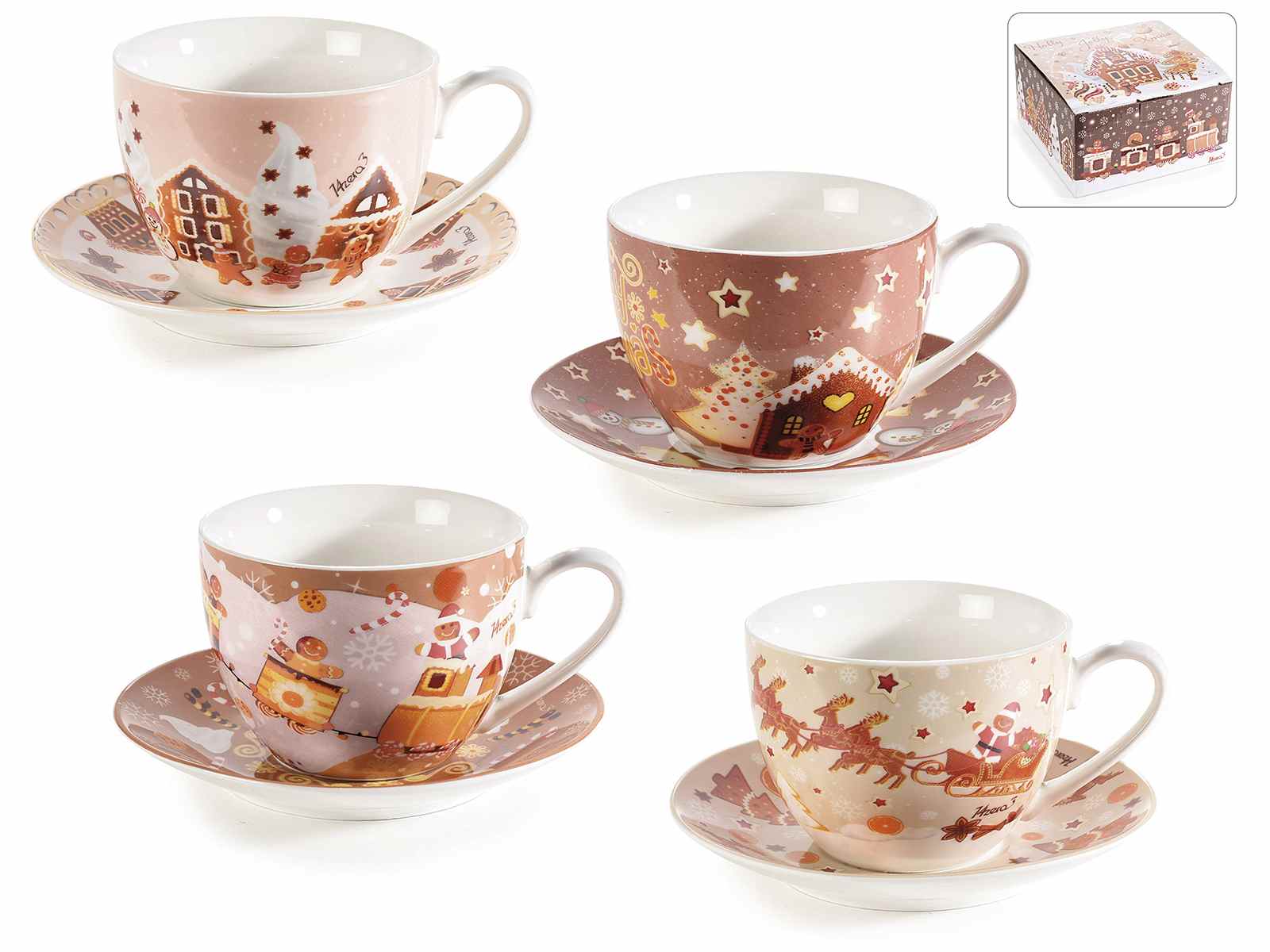Cești de ceai de turtă dulce de Crăciun din porțelan decorat și farfurie asortată în cutie cadou