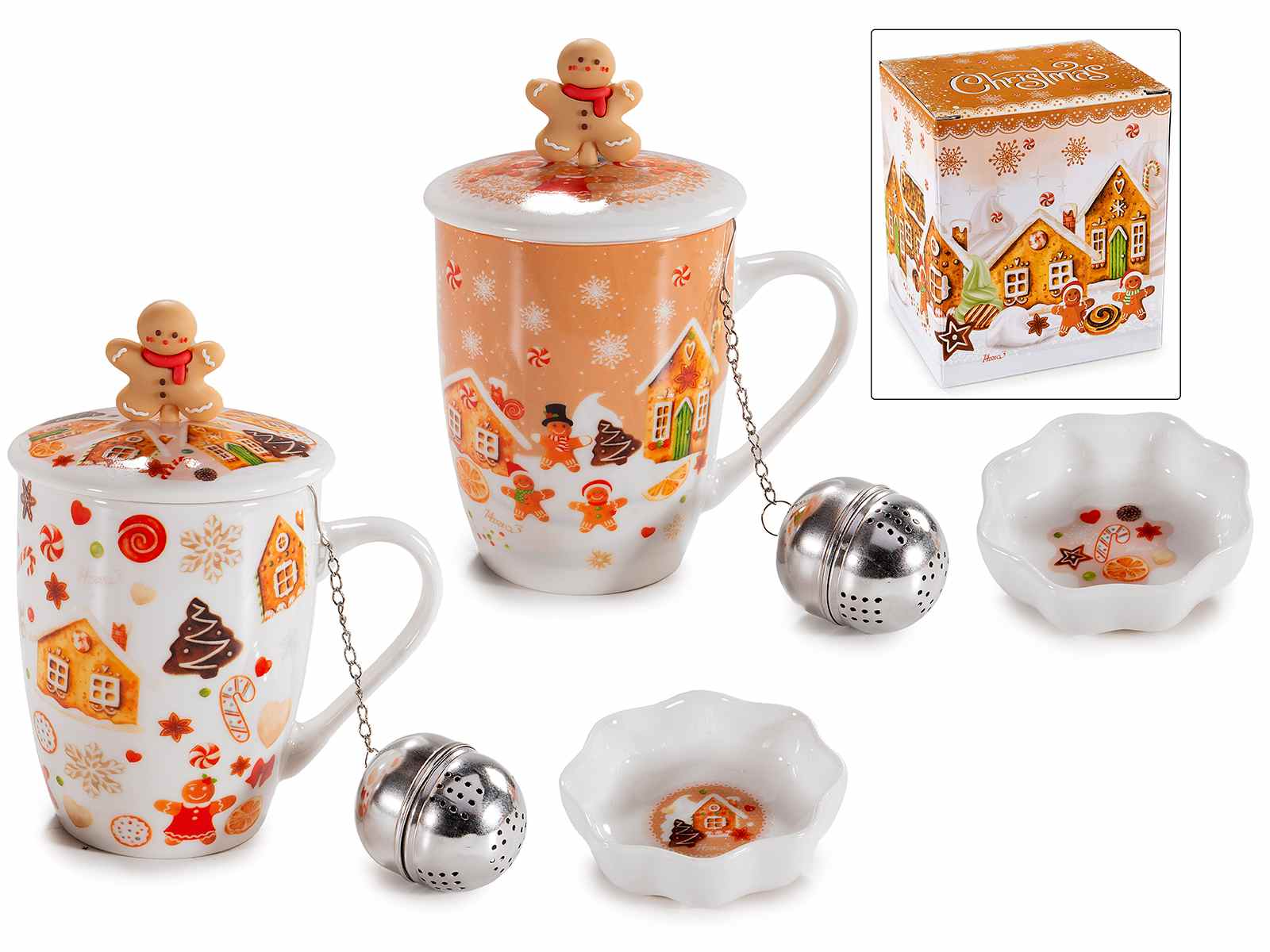 Căni de Crăciun 350 ml porțelan cu capac turtă dulce, farfurie, filtru și cutie cadou