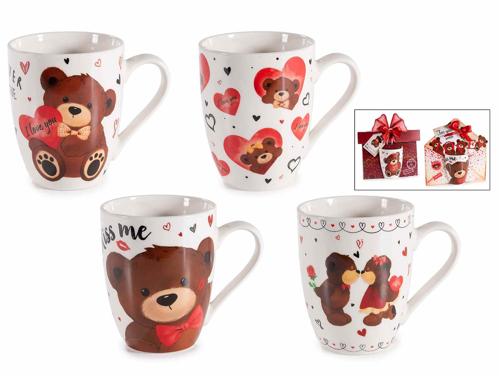 Căni de porțelan cu decorațiuni în formă de ursuleț de pluș, într-o cutie cadou în formă de fundă. Ideale ca și cadou de Ziua Îndrăgostiților, Crăciun și pentru ocazii speciale.